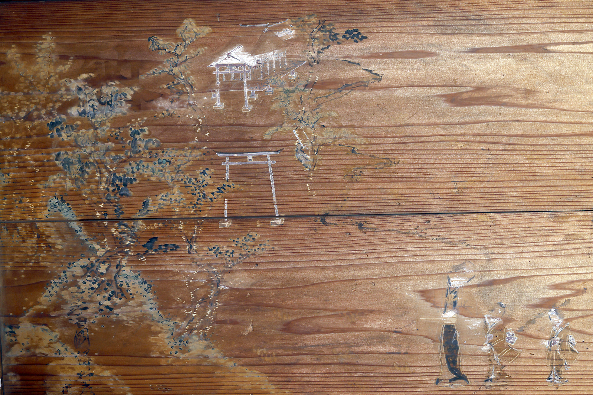 本殿の右側にあった彫刻「翁像」は文久元年五月、東都日本橋の木彫師、後藤三治郎橘恒徳作によるものです。左右に新たに「神武天皇御姿像」と「天の岩戸開き」の彫刻をおさめ、他に社明額一枚を新調しました。